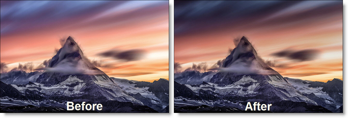 ND (Neutral Density) Gradient darkens only a portion of the image using a graduated transition between the darkened portion and the original image. It selectively adjusts brightness without affecting color balance. The most likely use for ND Gradient would be to balance the difference between the sky and ground in a landscape.