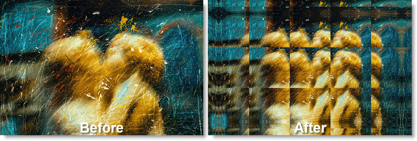 Breaks the image into rectangular shaped tiles and transforms the image within each shape to create a fly's eye view effect.
