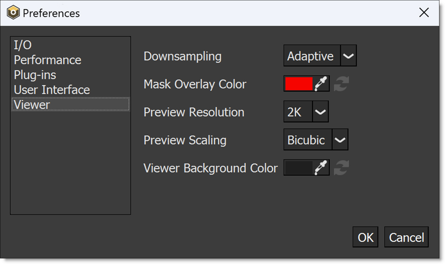 Preferences allow you to customize default settings and are categorized by function: I/O, Performance, Plug-ins, User Interface, and Viewer.