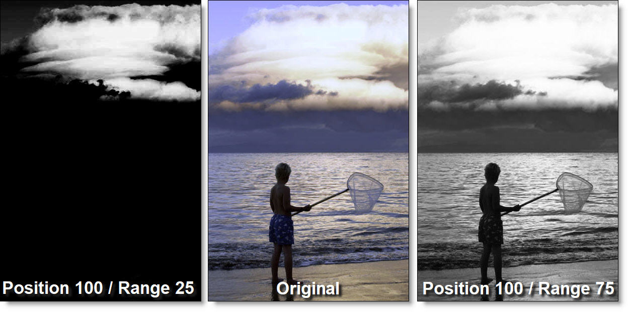 Using the Luminance extraction method, a higher Position value shows more white values from the original image as white values in the mask. A lower Position value shows more black values from the original image as white values in the mask.
