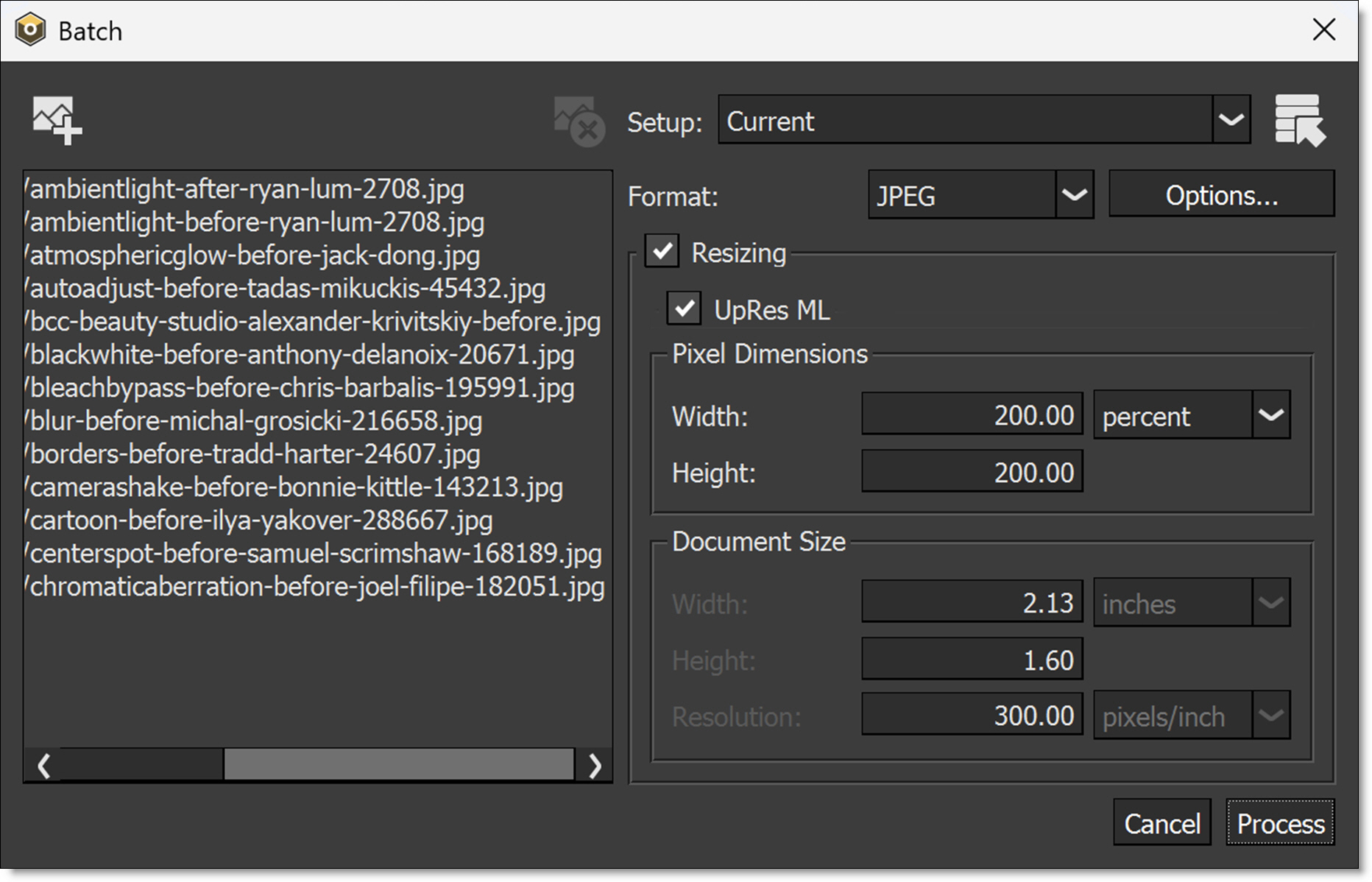 Use resizing to adjust the pixel dimensions, document size and resolution of the batched images.