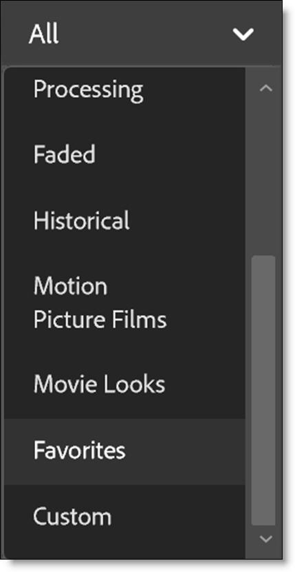 To sort the Presets window by Favorites, select Favorites in the Presets pop-up menu.