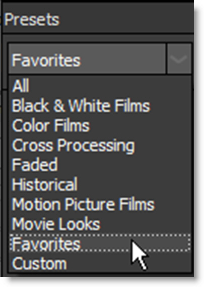 To sort the Presets window by Favorites, select Favorites in the Presets pop-up menu.